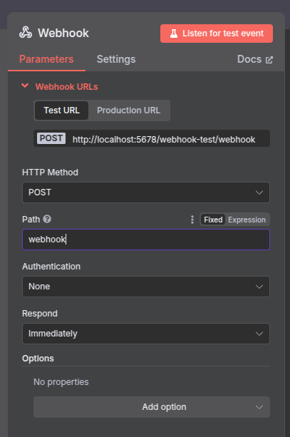 • Path: webhook (ou qualquer outro caminho que você preferir)