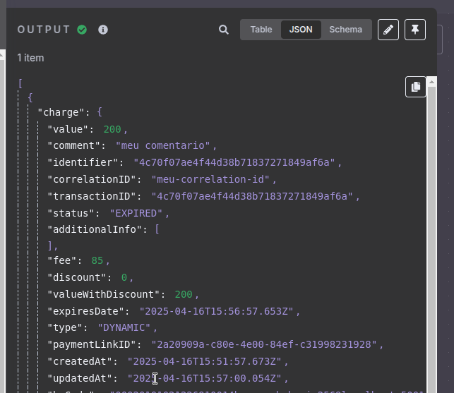 Ao clicar em "Test step" você receberá uma saida similar a esta confirmando a criação da cobrança
