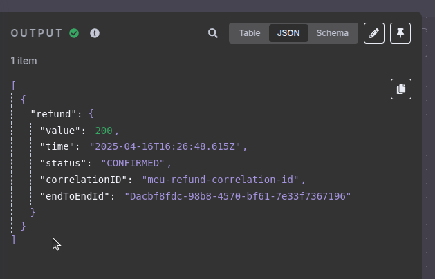 Ao clicar em "Test step" você receberá uma saida similar a esta confirmando o reembolso da cobrança