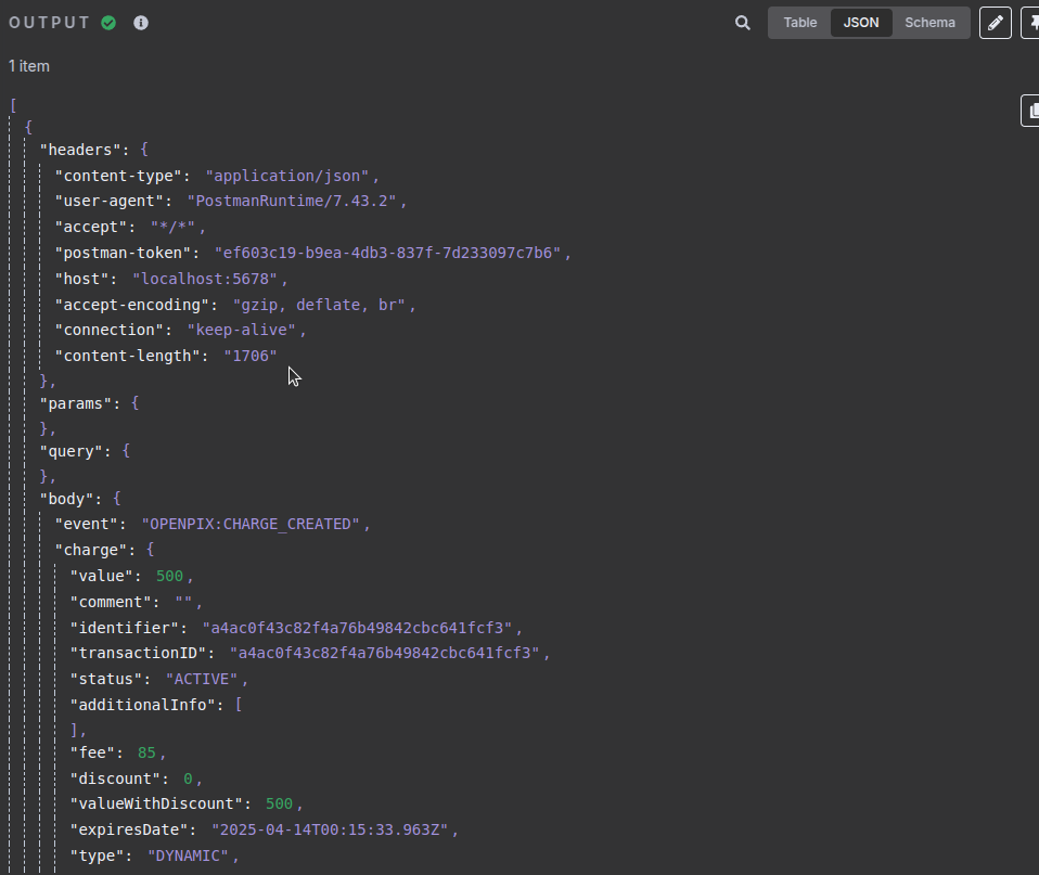 Ao receber um webhook da OpenPix, você verá uma saída similar a esta: