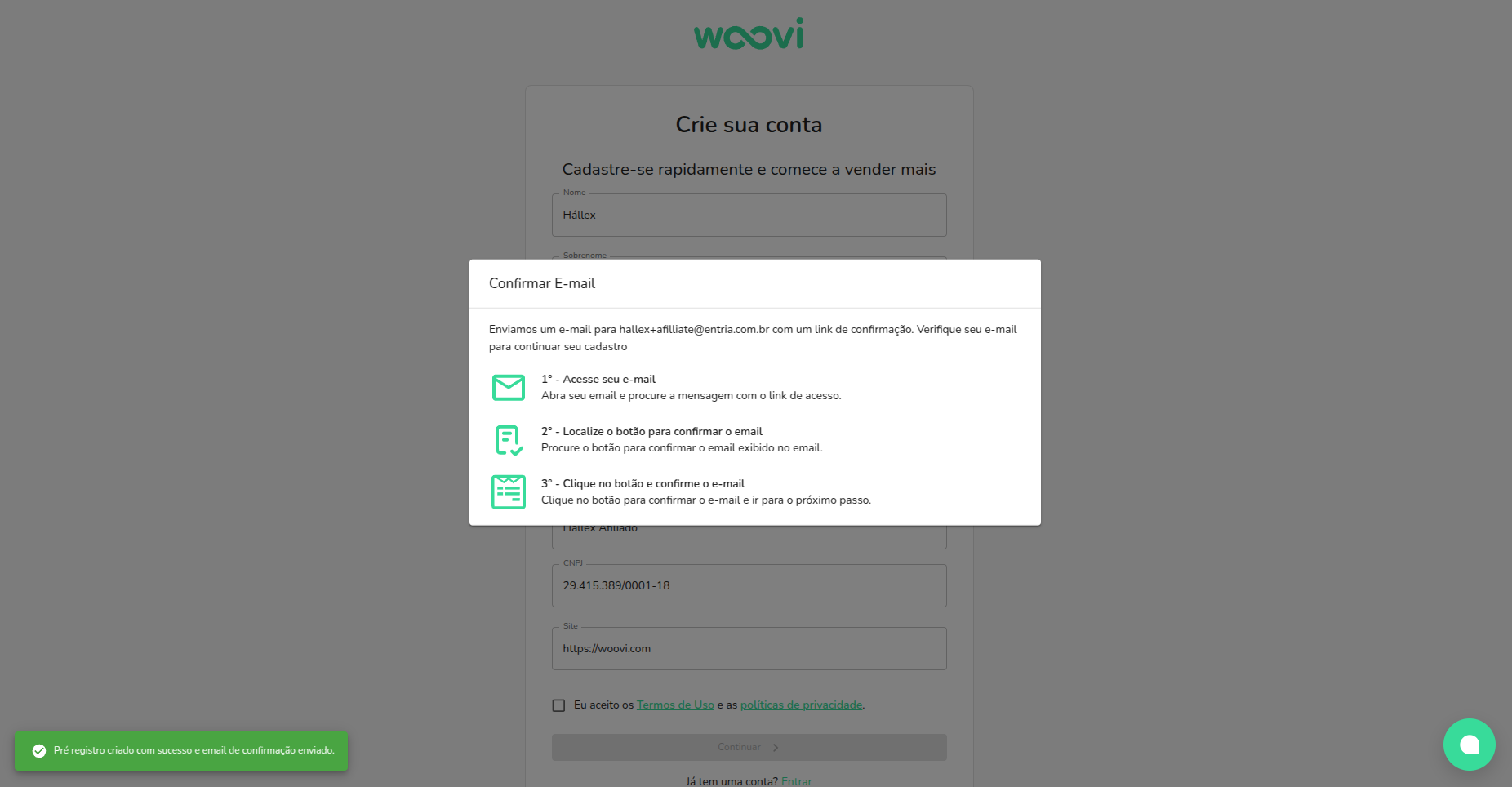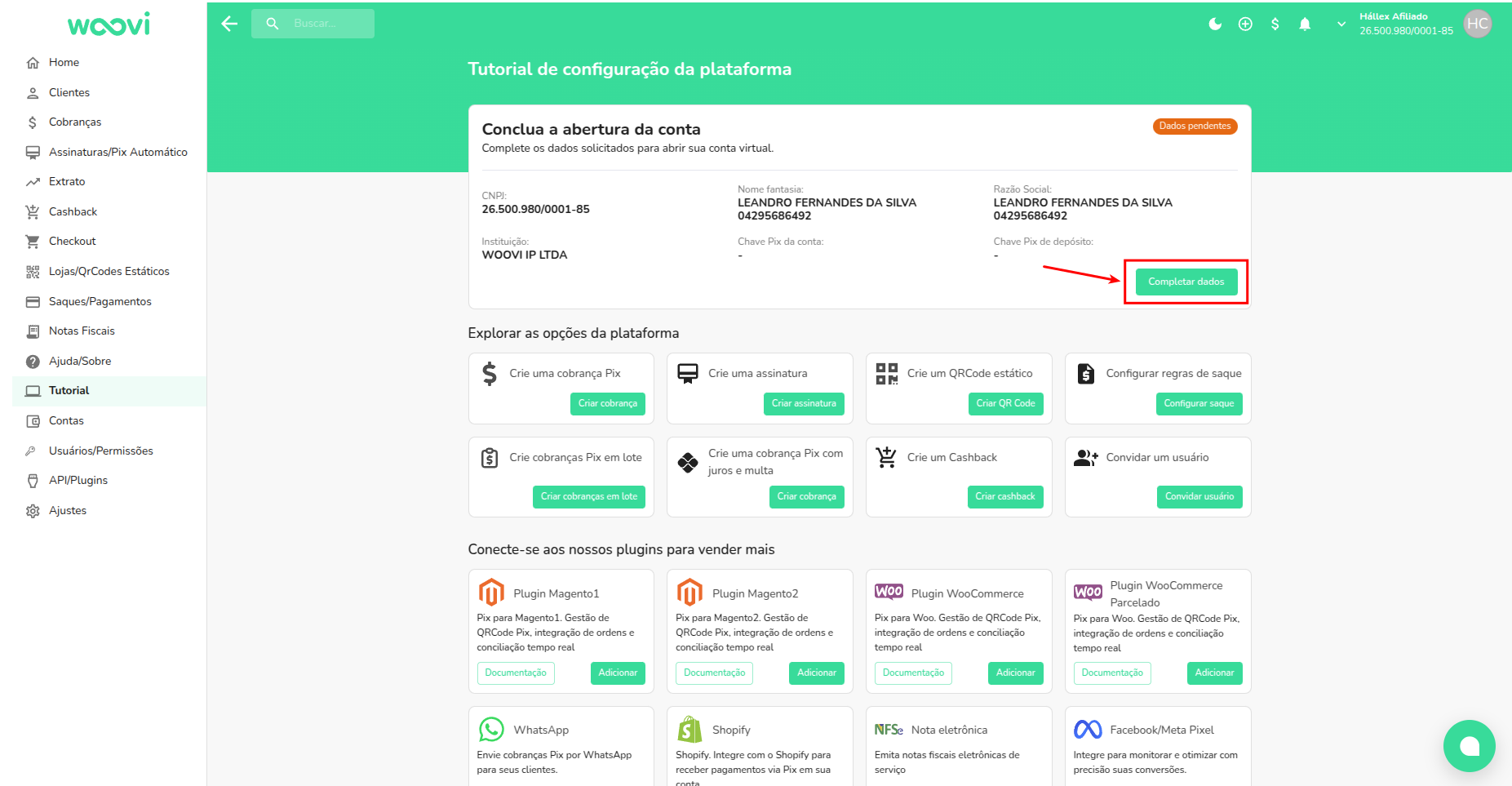 - Após enviar o link para seu afiliado ou você clicar em novas empresa, ele/você poderá cadastrar na Woovi, essa conta será vinculado a sua empresa