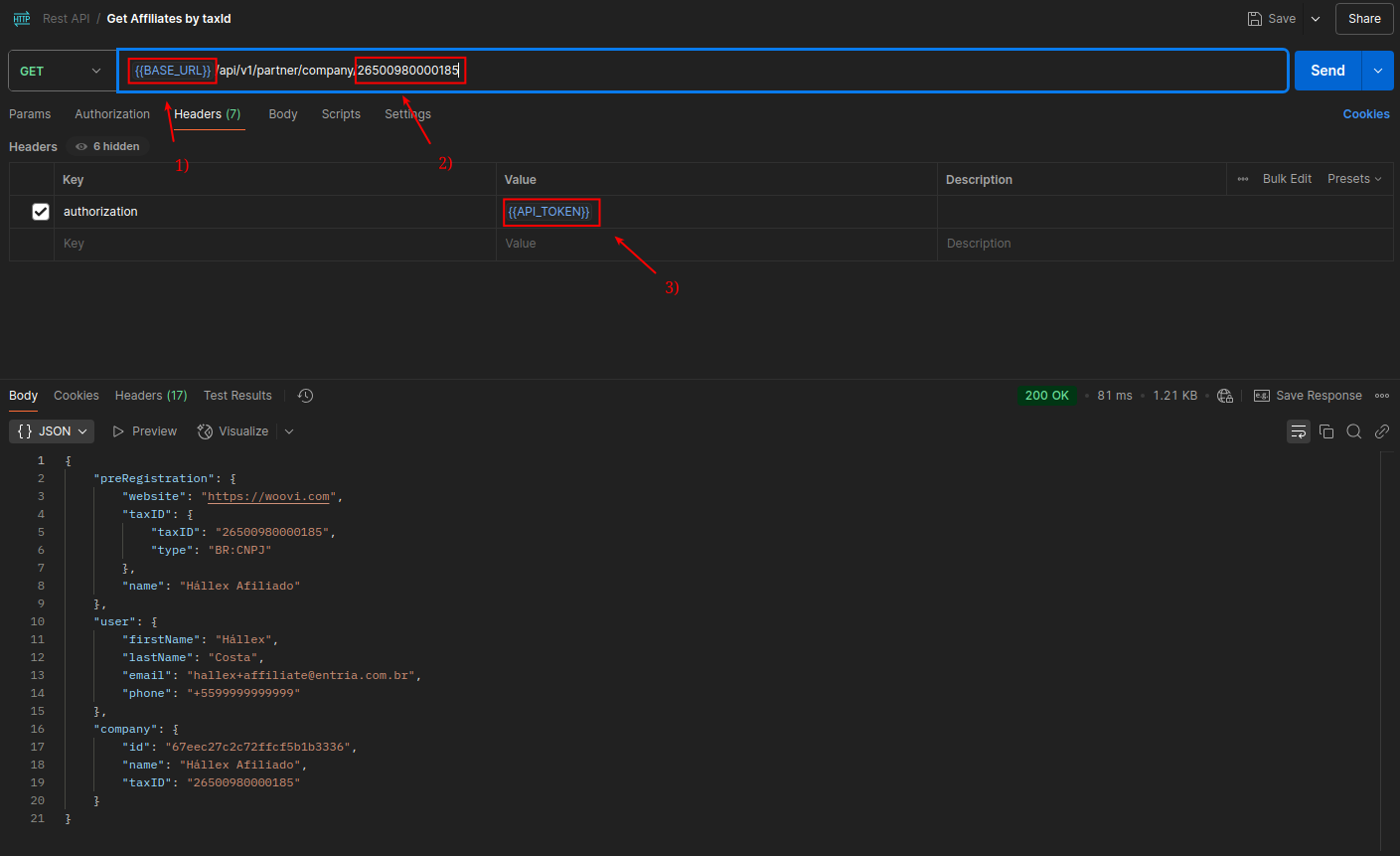 Você pode fazer um chamada para o nosso endpoint /api/v1/partner/company/{taxID} informando o seu appID no header de Authorization da sua requisição, e também substituindo o parâmetro taxID pelo CNPJ do seu afiliado pré-registrado