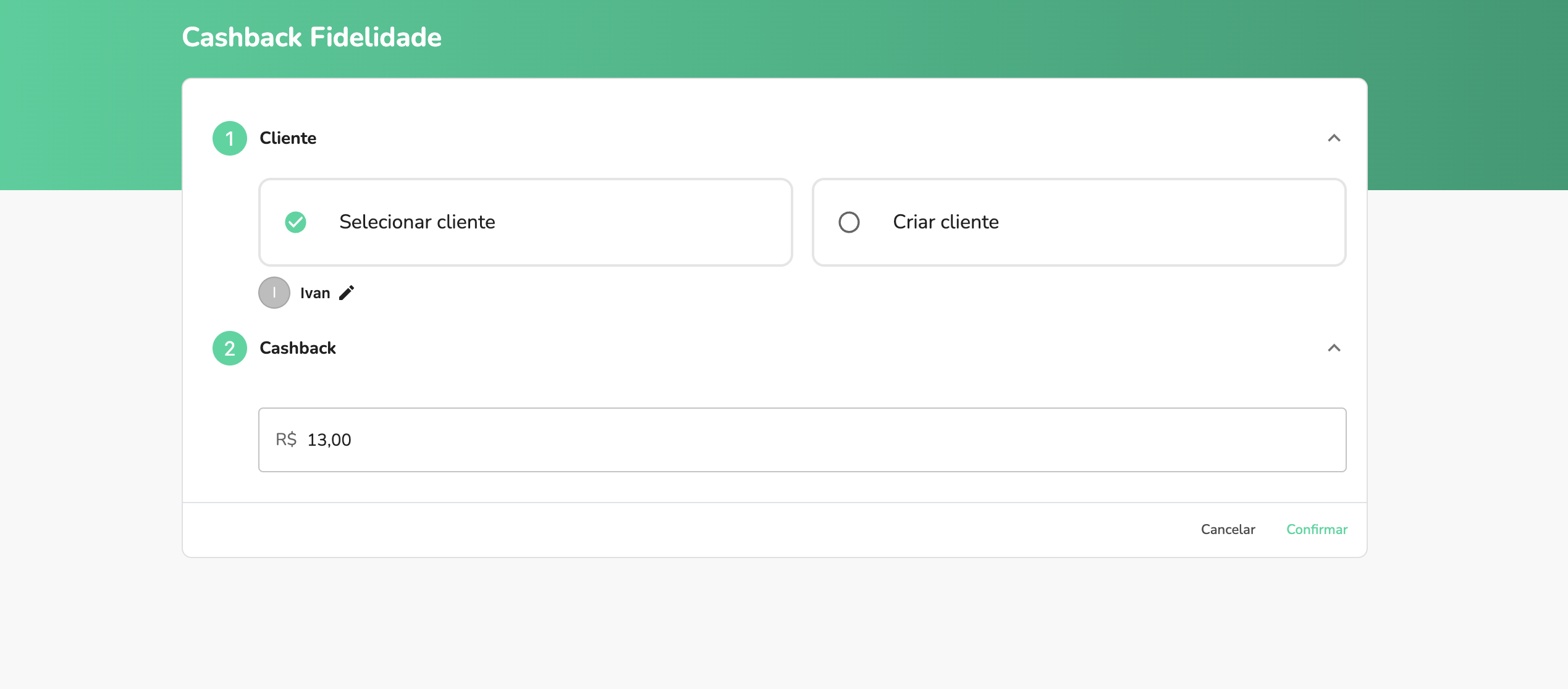 Preencha o formulário com o cliente e o valor que você deseja dar esse Cashback