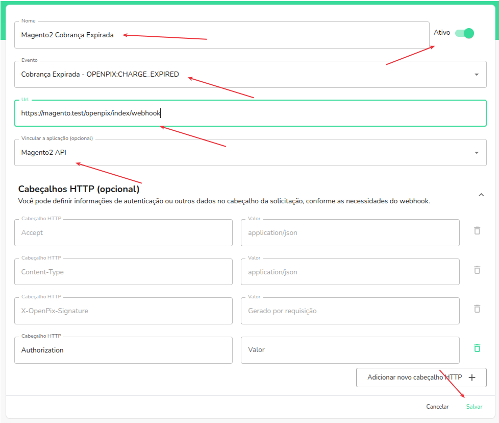 - URL: use o mesmo endereço de webhook aplicado no webhook de "Cobrança Paga", em nosso exemplo estou usando https://magento.test/openpix/index/webhook