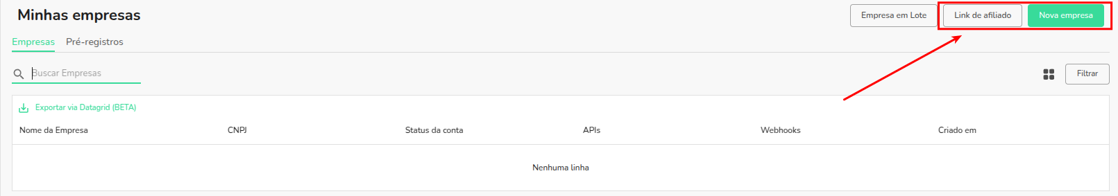 - Pré-registro: onde você verá todas as empresas que iniciaram um pré-cadastro como seu afiliado, porém não completaram a validação e ativação da conta