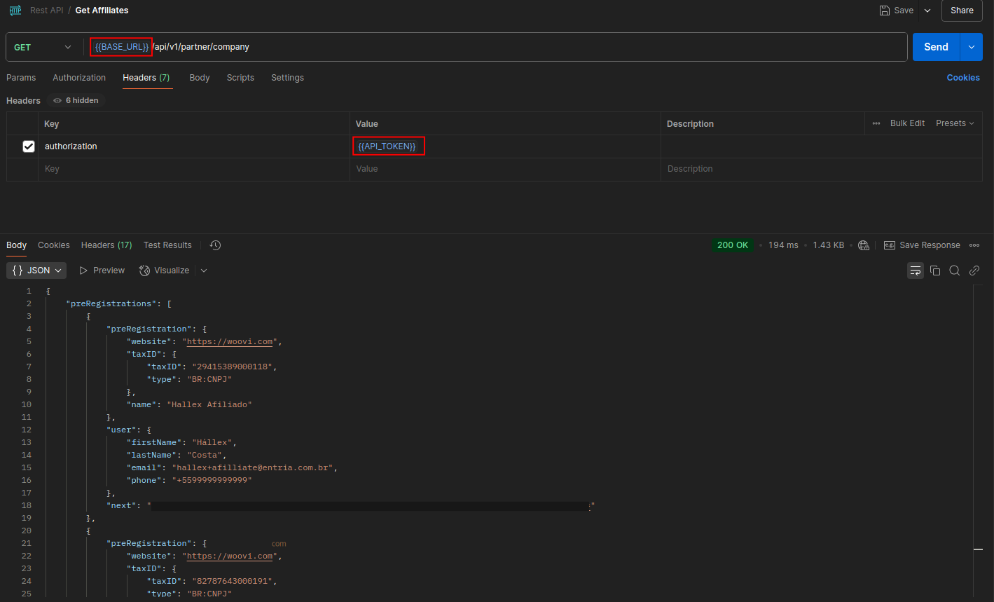 Você pode fazer um chamada para o nosso endpoint /api/v1/partner/company/{taxID} informando o seu appID no header de Authorization da sua requisição, e também substituindo o parâmetro taxID pelo CNPJ do seu afiliado pré-registrado