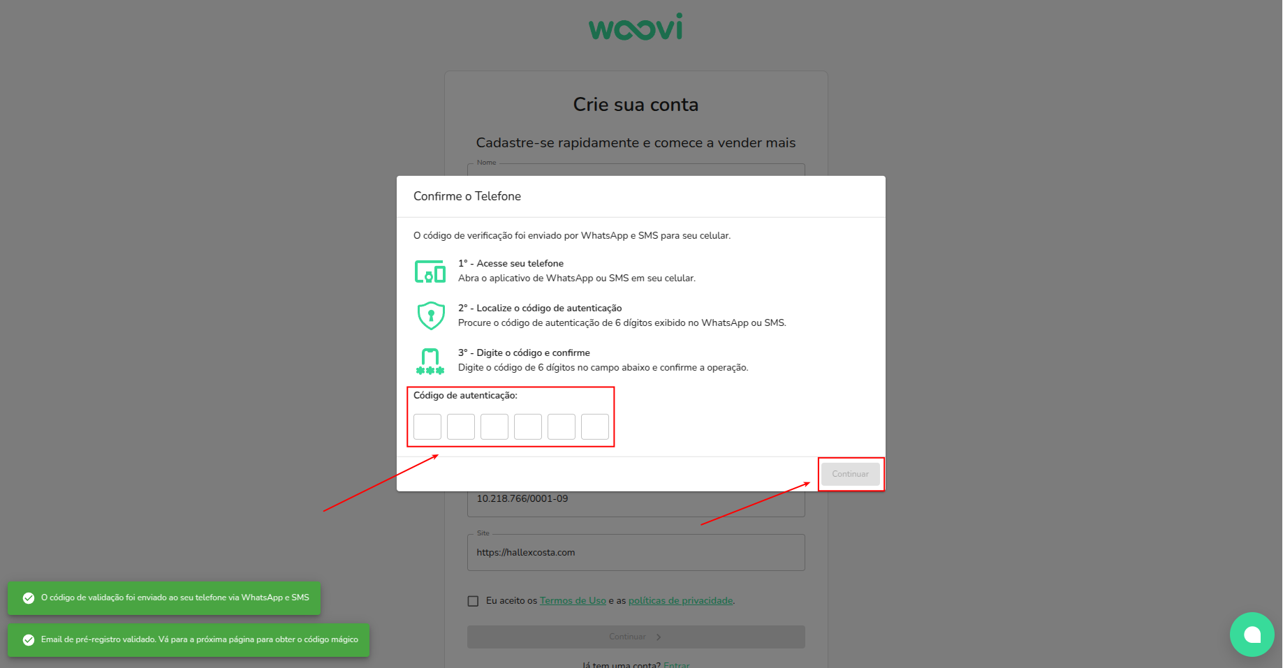 - Ele será redirecionado para a plataforma da woovi novamente, e solicitare-mos um código de validação de número de telefone que será enviado para ele via SMS ou Whatsapp dele