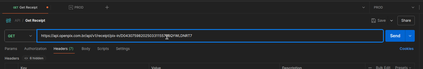 Depois, você pode copiar seu endToEndId e adicioná-lo à URL da requisição da API, utilizando o tipo de comprovante como sendo pix-in
